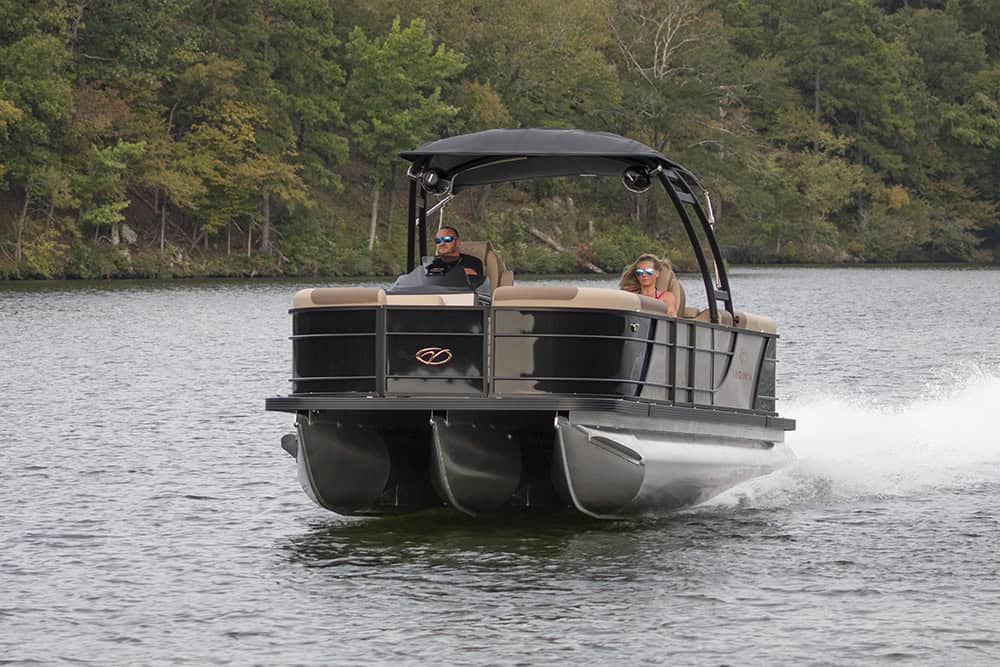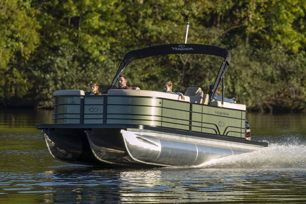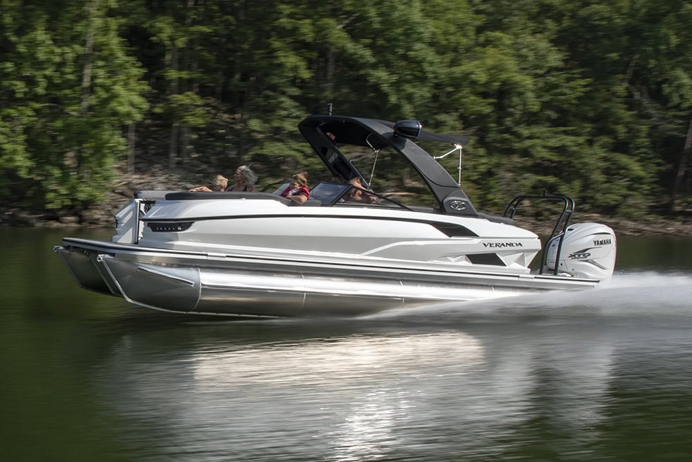 The Veranda V One is a flagship tri-toon that blends striking fiberglass design with precision engineering, premium audio, lighting, and navigation built on Veranda’s patented all-aluminum interlocking deck system. Available in both 25’ and 27’ twin-engine configurations powered by Yamaha, the V One delivers head-turning performance and a refined, high-energy on-water experience.